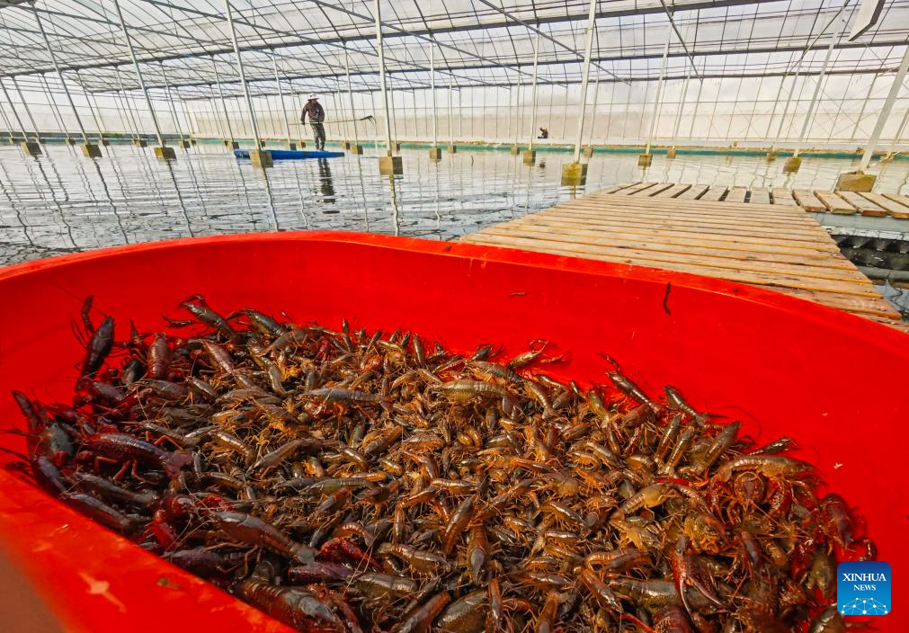 Crayfish are pictured at a crayfish breeding company in Xuyi County, east China's Jiangsu Province, March 8, 2025. As the temperature rises, crayfish are on the market in Xuyi County, a well-known crayfish production hub in China. In recent years, Xuyi has vigorously developed crayfish industry. The ecological breeding area of crayfish in the county has reached one million mu (about 66,667 hectares), and over 210,000 people are involved in the crayfish industry. Crayfish industry has become a boost to the local rural revitalization. (Photo by Zhu Tianyu/Xinhua)