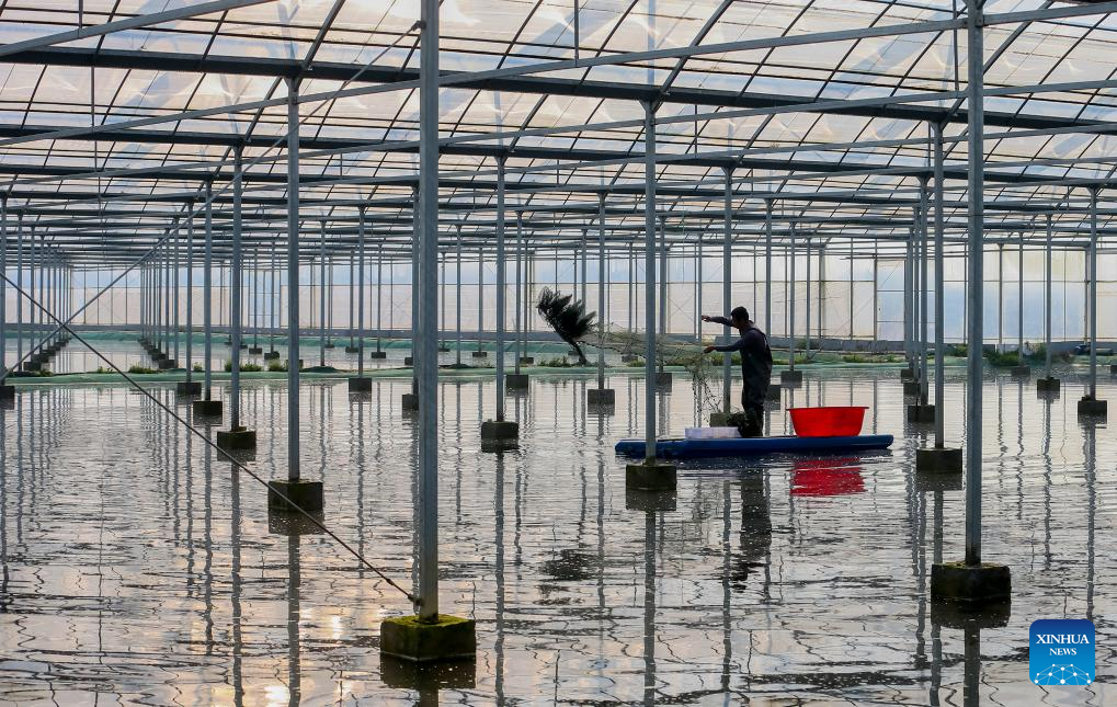 A farmer works in a crayfish field of a demonstration base in Xuyi County, east China's Jiangsu Province, March 8, 2025. As the temperature rises, crayfish are on the market in Xuyi County, a well-known crayfish production hub in China. In recent years, Xuyi has vigorously developed crayfish industry. The ecological breeding area of crayfish in the county has reached one million mu (about 66,667 hectares), and over 210,000 people are involved in the crayfish industry. Crayfish industry has become a boost to the local rural revitalization. (Photo by Qian Xianhua/Xinhua)