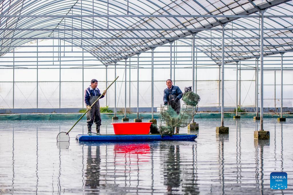 Farmers work in a crayfish field of a demonstration base in Xuyi County, east China's Jiangsu Province, March 8, 2025. As the temperature rises, crayfish are on the market in Xuyi County, a well-known crayfish production hub in China. In recent years, Xuyi has vigorously developed crayfish industry. The ecological breeding area of crayfish in the county has reached one million mu (about 66,667 hectares), and over 210,000 people are involved in the crayfish industry. Crayfish industry has become a boost to the local rural revitalization. (Photo by Yang Yugang/Xinhua)
