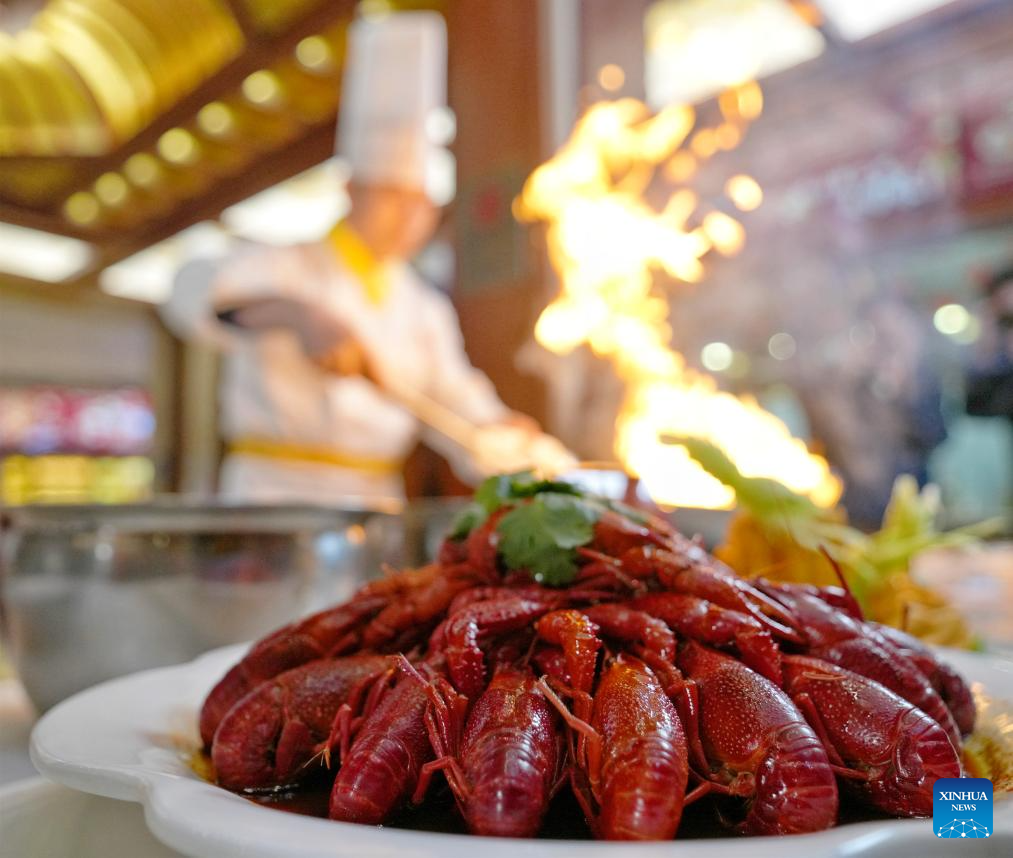 A chef cooks crayfish at a restaurant in Xuyi County, east China's Jiangsu Province, March 8, 2025. As the temperature rises, crayfish are on the market in Xuyi County, a well-known crayfish production hub in China. In recent years, Xuyi has vigorously developed crayfish industry. The ecological breeding area of crayfish in the county has reached one million mu (about 66,667 hectares), and over 210,000 people are involved in the crayfish industry. Crayfish industry has become a boost to the local rural revitalization. (Photo by Gu Jihong/Xinhua)