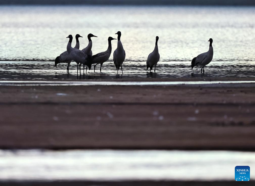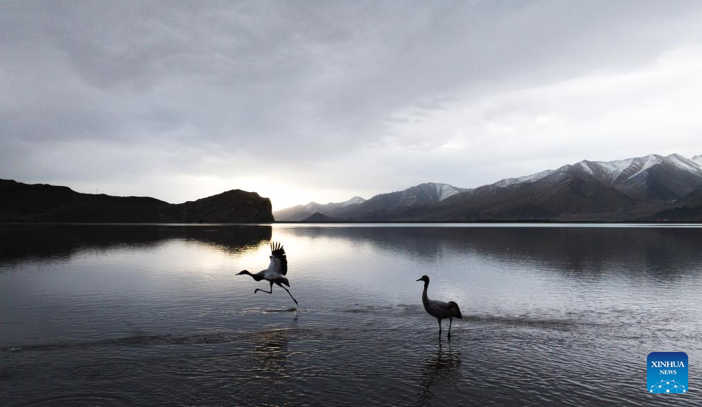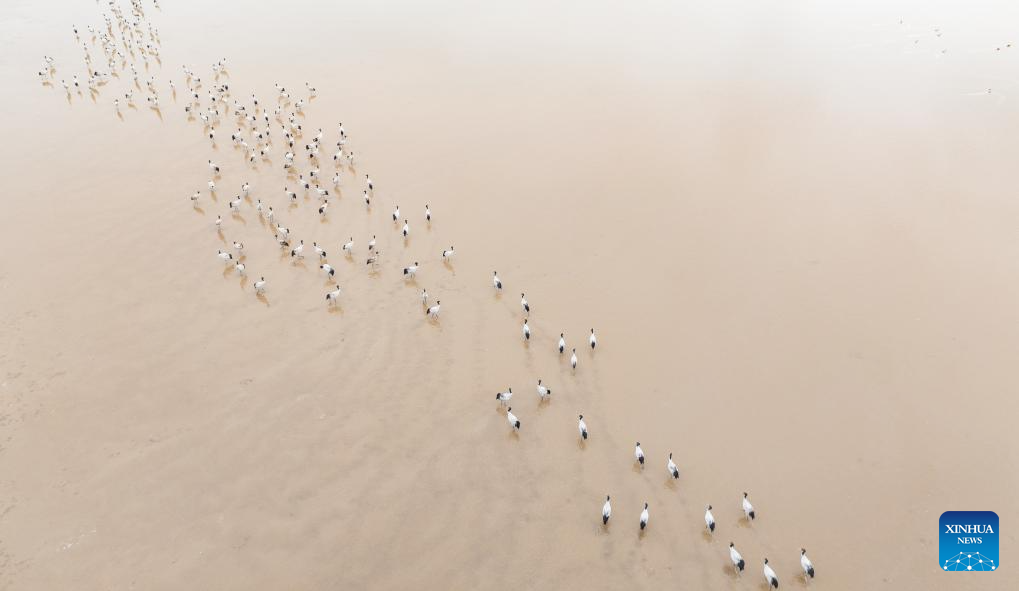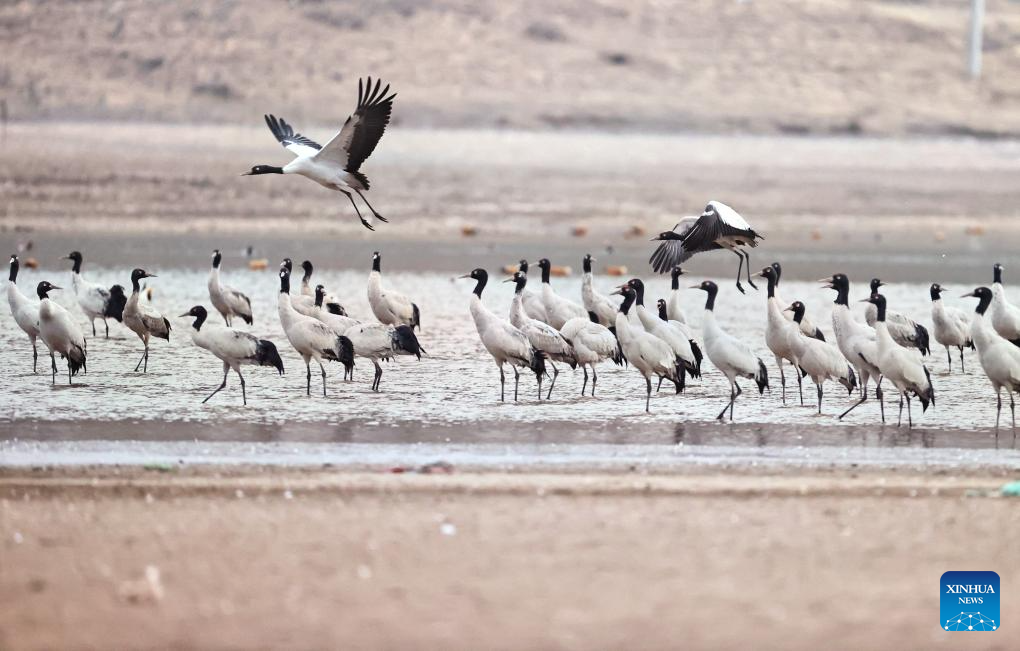 Black-necked cranes overwinter at a reservoir in Lhunzhub County of Lhasa, southwest China's Xizang Autonomous Region, March 8, 2025. (Xinhua/Jiang Fan)