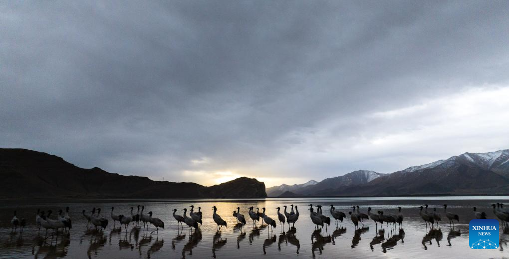 A flock of black-necked cranes overwinters at a reservoir in Lhunzhub County of Lhasa, southwest China's Xizang Autonomous Region, March 8, 2025. (Xinhua/Tenzin Nyida)