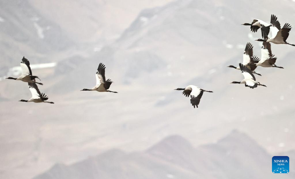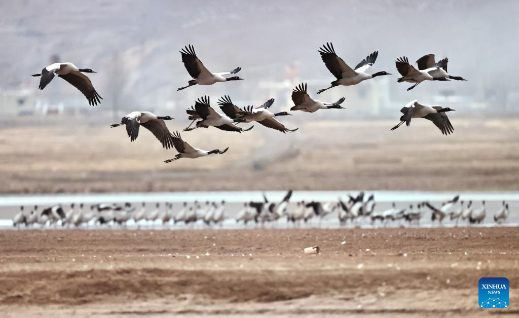 Black-necked cranes fly over a reservoir in Lhunzhub County of Lhasa, southwest China's Xizang Autonomous Region, March 8, 2025. (Xinhua/Jiang Fan)