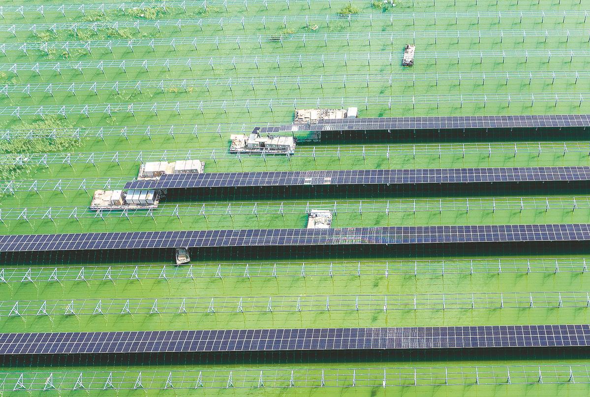 Workers install solar panels over a fishery pond for green energy development in Yuyao, Zhejiang province. (Photo/Xinhua)