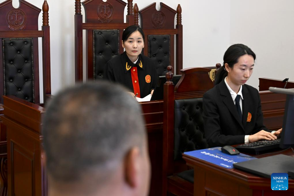 Hou Yanrong (R), a judge with the People's Court of Haidian District of Beijing, conducts a trial online at the Court in Beijing, capital of China, March 6, 2025. (Xinhua/Huang Bohan)