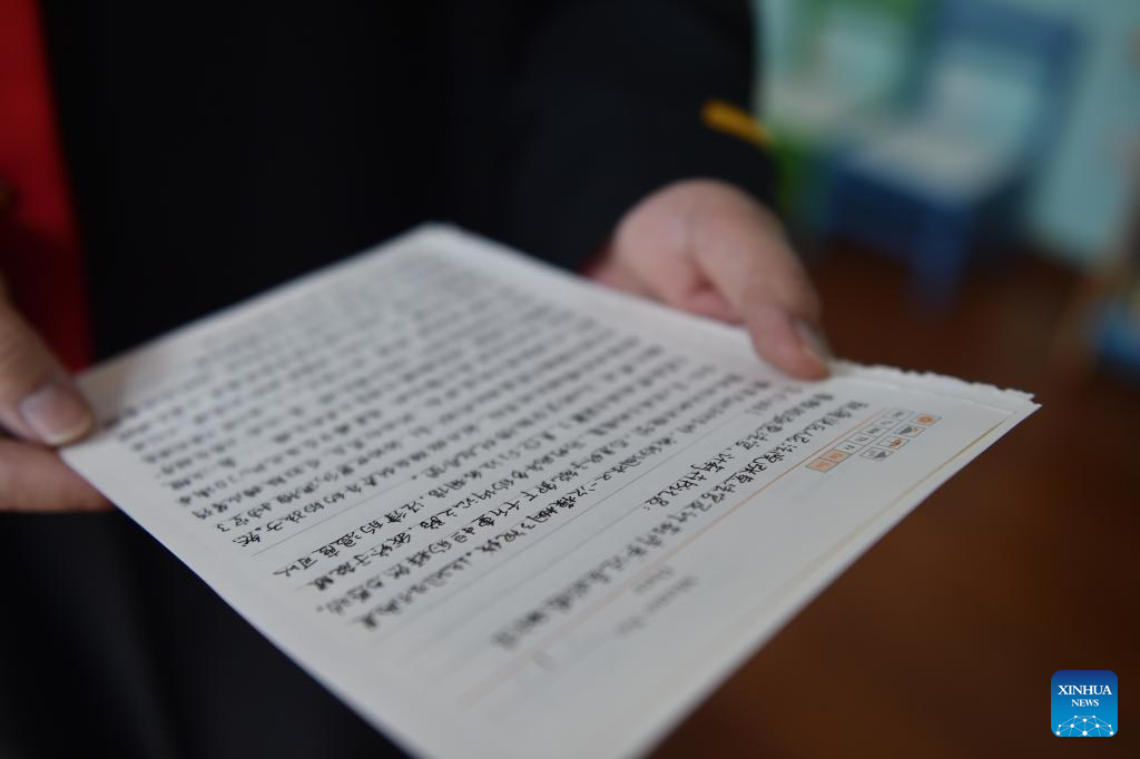 Zhang Ying, a judge with the People's Court of Haidian District of Beijing, holds a letter of gratitude from a litigant at a juvenile court of the People's Court of Haidian District in Beijing, capital of China, March 4, 2025.(Xinhua/Zhao Tingting)