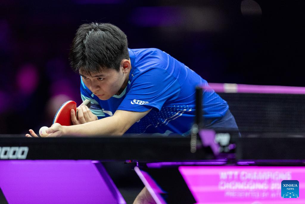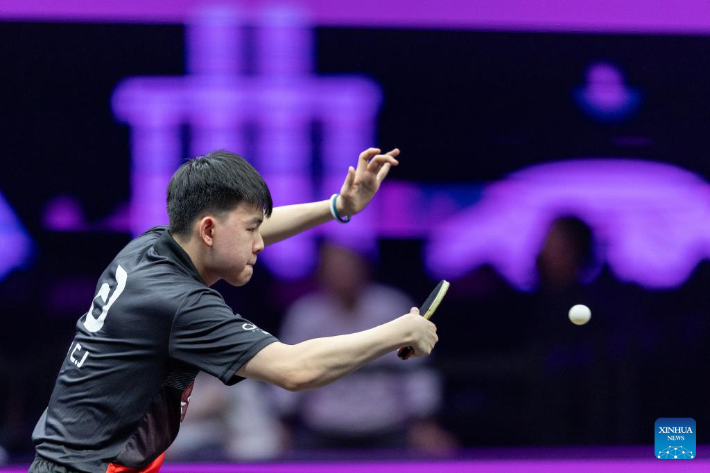 Kao Cheng-Jui of Chinese Taipei hits a return during the men's singles round of 32 match against Lin Shidong of China at the WTT Champions Chongqing 2025 in southwest China's Chongqing, March 11, 2025. (Xinhua/Huang Wei)