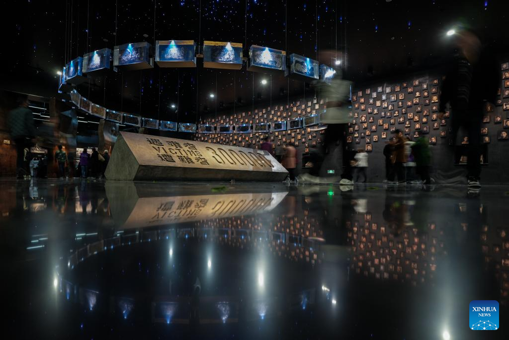 People visit the Memorial Hall of the Victims in Nanjing Massacre by Japanese Invaders, in Nanjing, east China's Jiangsu Province, March 11, 2025. A "lights out" mourning ceremony for four survivors of the Nanjing Massacre who passed away this year was held Tuesday in Nanjing.