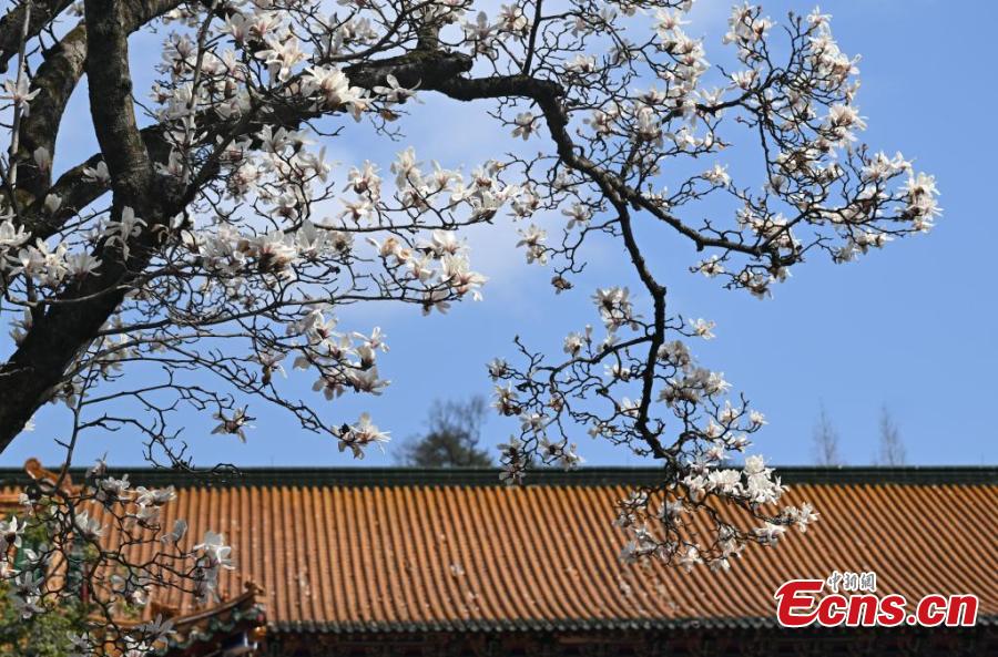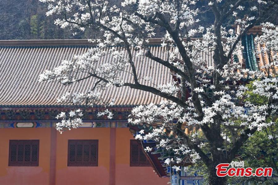 Magnolia flowers blossom at an ancient temple, adding beauty in the spring season in Hangzhou, east China's Zhejiang Province, March 11, 2025. (China News Service/Wang Gang)