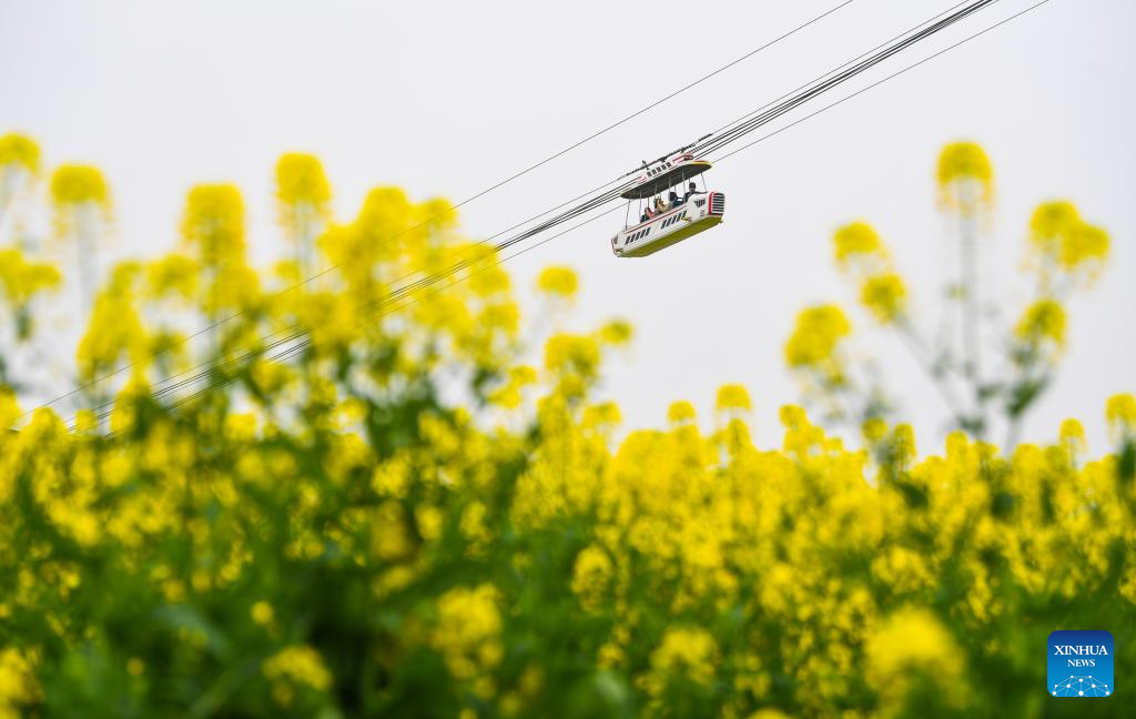 Tourists take a cable car to enjoy the scenery of rapeseed flowers at Chongkan scenic spot in Tongnan District, southwest China's Chongqing Municipality, March 12, 2025. As spring unfolds, rapeseed flowers here have entered the blooming season, attracting tourists to visit. (Xinhua/Wang Quanchao)