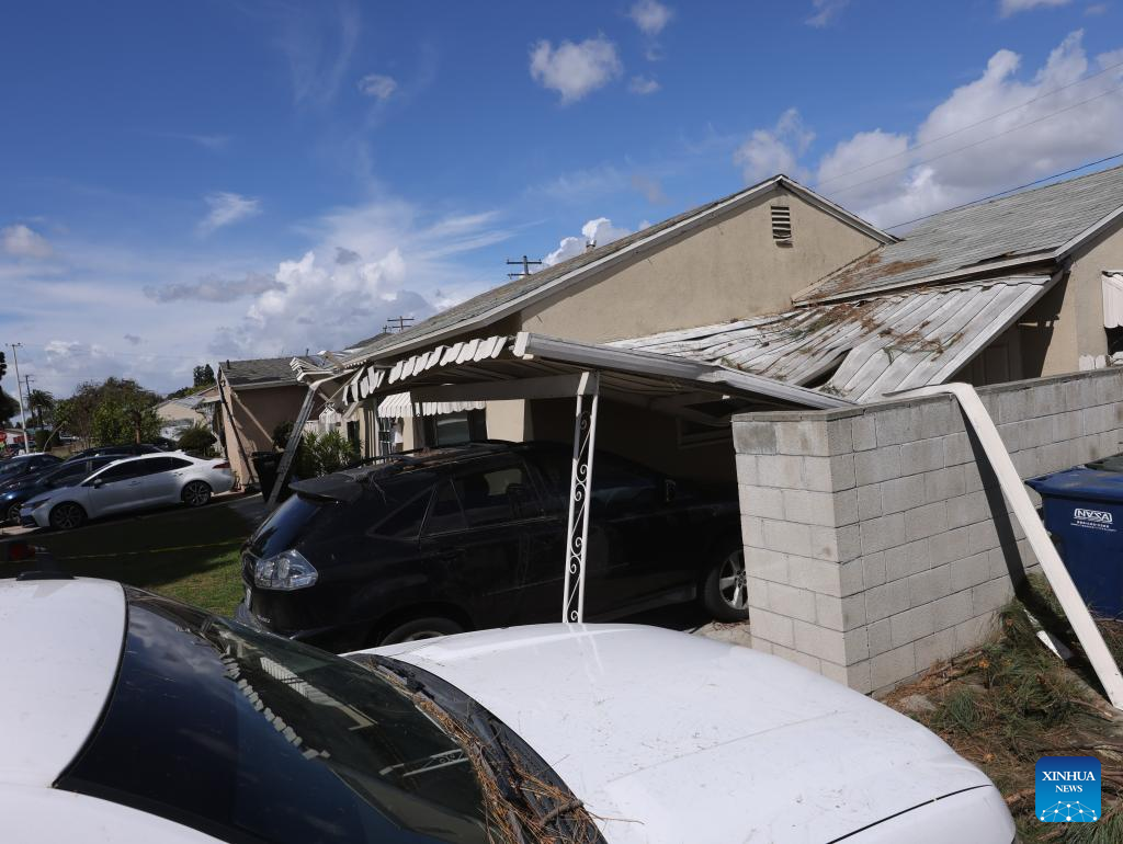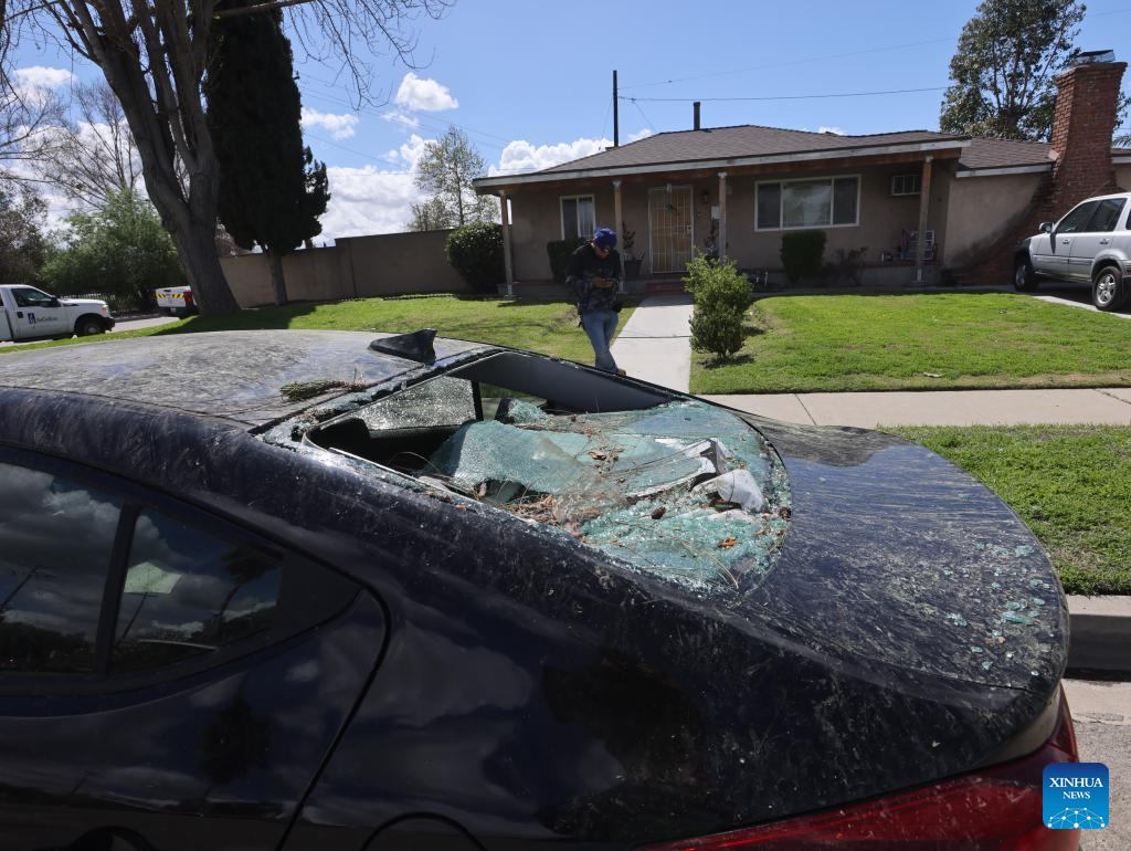 Photo taken on March 13, 2025 shows a car damaged by a tornado in Pico Rivera, Los Angeles, California, the United States. A tornado ripped through Los Angeles County, Southern California, early Thursday morning, the U.S. National Weather Service (NWS) confirmed. The tornado caused exterior damage to homes and cars, and snapped multiple trees, said NWS. (Photo by Qiu Chen/Xinhua)