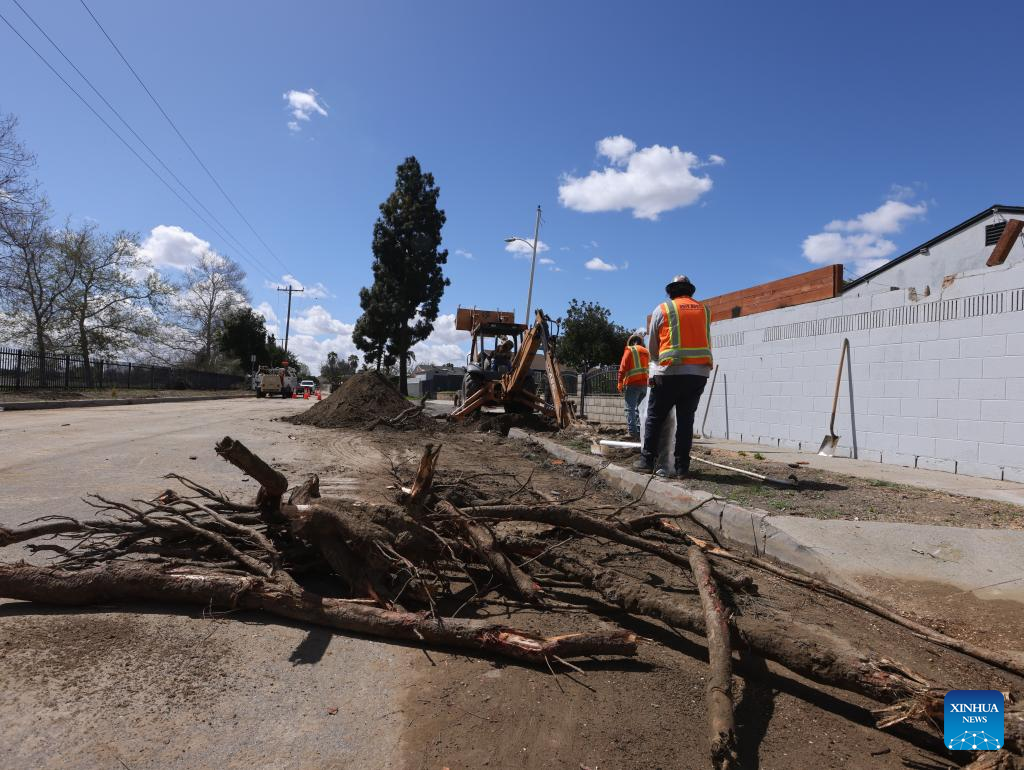 People work on a street after a tornado in Pico Rivera, Los Angeles, California, the United States, on March 13, 2025. A tornado ripped through Los Angeles County, Southern California, early Thursday morning, the U.S. National Weather Service (NWS) confirmed. The tornado caused exterior damage to homes and cars, and snapped multiple trees, said NWS. (Photo by Qiu Chen/Xinhua)