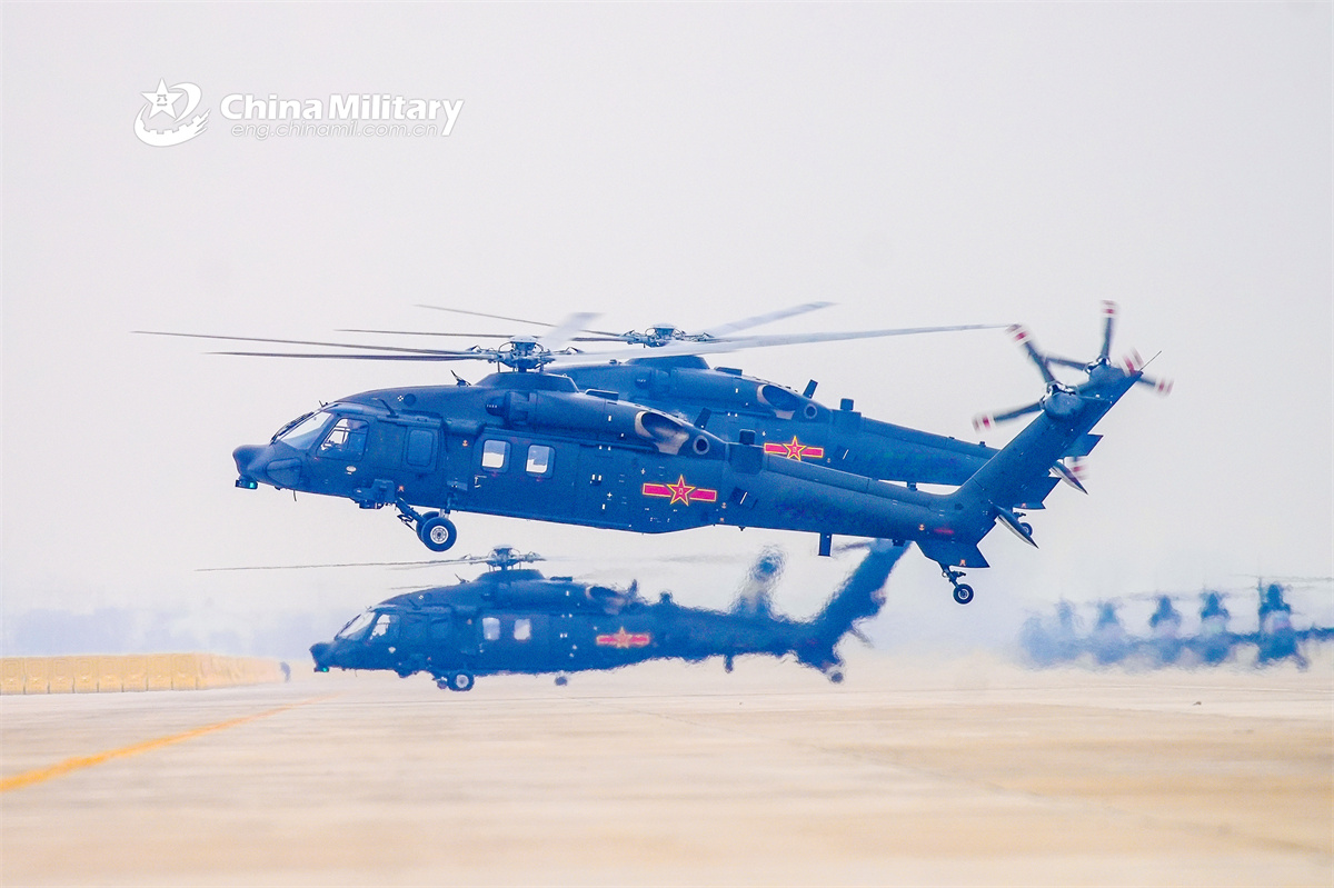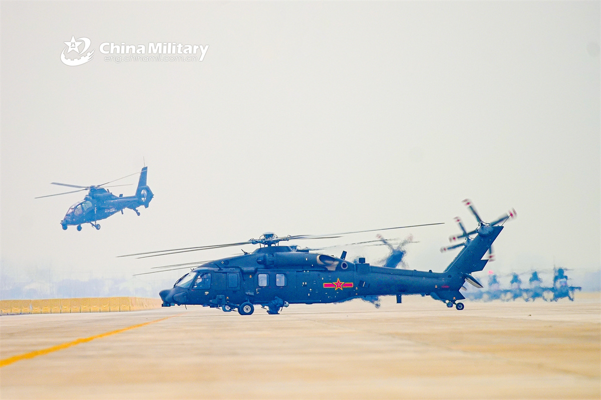 Multi-type army helicopters attached to a brigade under the Chinese PLA Army lift off successively for a flight training exercise in late February 2025. (eng.chinamil.com.cn/Li Jingyou)