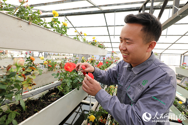 A staff member checks on the growth of flowers at an artificial wetland in Pingdu city, east China's Shandong Province. (People's Daily Online/Liu Qi)