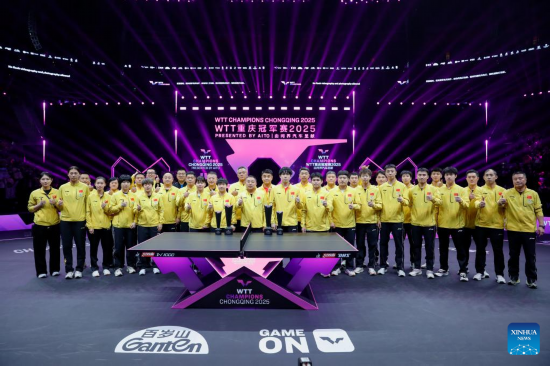 Team China pose for photos during the awarding ceremony of the WTT Champions Chongqing 2025 in Chongqing, southwest China, March 16, 2025. (Xinhua/Huang Wei)