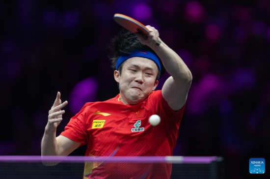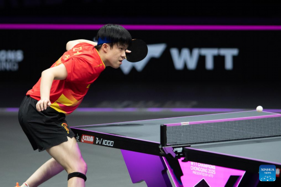 Wang Chuqin hits a return during the men's singles final between Wang Chuqin of China and Lin Shidong of China at the WTT Champions Chongqing 2025 in Chongqing, southwest China, March 16, 2025. (Xinhua/Huang Wei)
