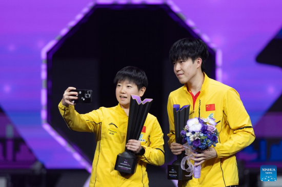 Sun Yingsha (L) and Wang Chuqin of China pose for photos during the awarding ceremony of the WTT Champions Chongqing 2025 in Chongqing, southwest China, March 16, 2025. (Xinhua/Huang Wei)