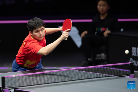 Lin Shidong hits a return during the men's singles final between Wang Chuqin of China and Lin Shidong of China at the WTT Champions Chongqing 2025 in Chongqing, southwest China, March 16, 2025. (Xinhua/Huang Wei)