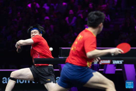 Wang Chuqin (L) hits a return during the men's singles final between Wang Chuqin of China and Lin Shidong of China at the WTT Champions Chongqing 2025 in Chongqing, southwest China, March 16, 2025. (Xinhua/Huang Wei)