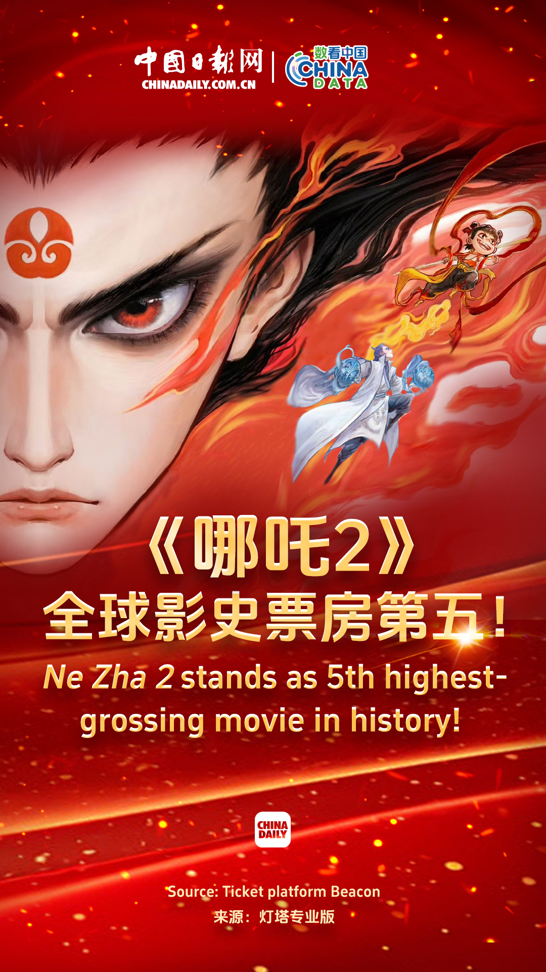 As of March 15, the Chinese animated movie Ne Zha 2 has generated over 15.019 billion yuan ($2.072 billion) in global box office, surpassed Star Wars: The Force Awakens, and become No 5 on the list of the highest-grossing films in global box office history.
