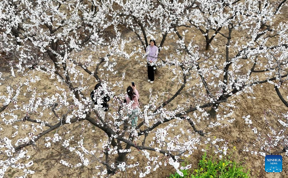 An aerial drone photo taken on March 15, 2025 shows tourists enjoying the scenery of apricot blossoms in Baofeng County of Pingdingshan City, central China's Henan Province. As the spring season is coming, flowers are in full bloom across the country. (Photo by He Wuchang/Xinhua)