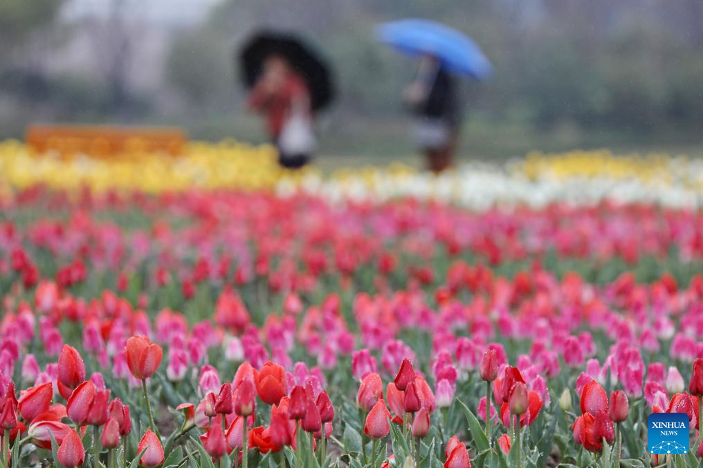 People enjoy the scenery of blooming tulips amid rain at a park in Jiaxing City, east China's Zhejiang Province, March 15, 2025. As the spring season is coming, flowers are in full bloom across the country. (Photo by Jin Peng/Xinhua)