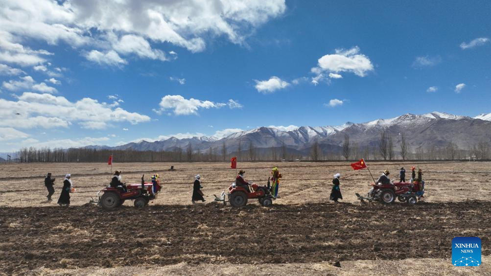 Farmers participate in a ceremony marking the start of spring farming in Quxar Town of Lnaze County, southwest China's Xizang Autonomous Region, March 16, 2025. Ceremonies marking the start of spring farming were held across Xizang on Sunday. The ceremony holds great significance as it marks the beginning of a new year's farming season and serves as a prayer for favorable weather and bountiful harvests. It is considered an important ritual in the farming regions of Xizang. (Xinhua/Jiang Fan)