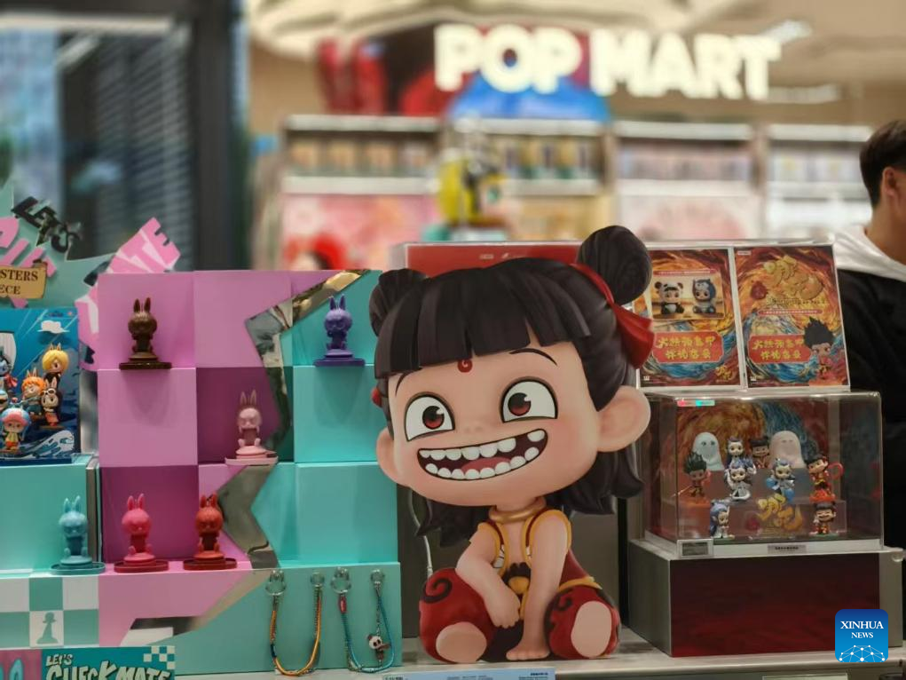 Cultural creative products of Chinese animated film Ne Zha 2 are pictured in a toy store in Chengdu, southwest China's Sichuan Province, March 4, 2025. (Xinhua/Lu Youyi)