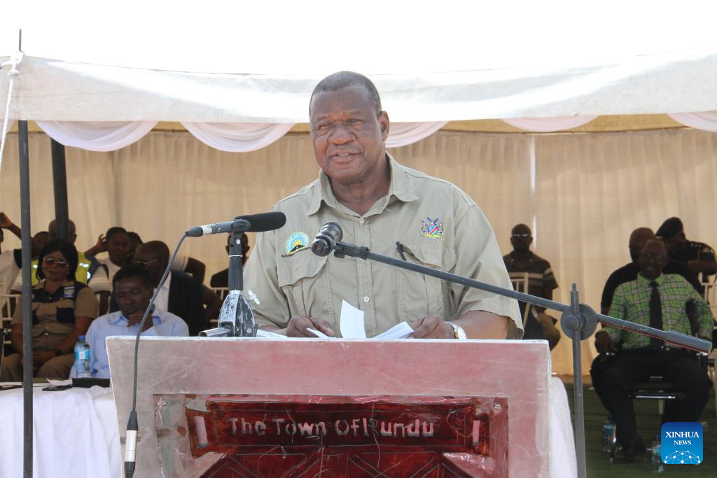 John Mutorwa, Namibia's deputy prime minister and minister of works and transport, speaks at the official opening of the Chinese-constructed John Mutorwa Road in Rundu, Namibia, on March 14, 2025. (Photo by Musa Kaseke/Xinhua)