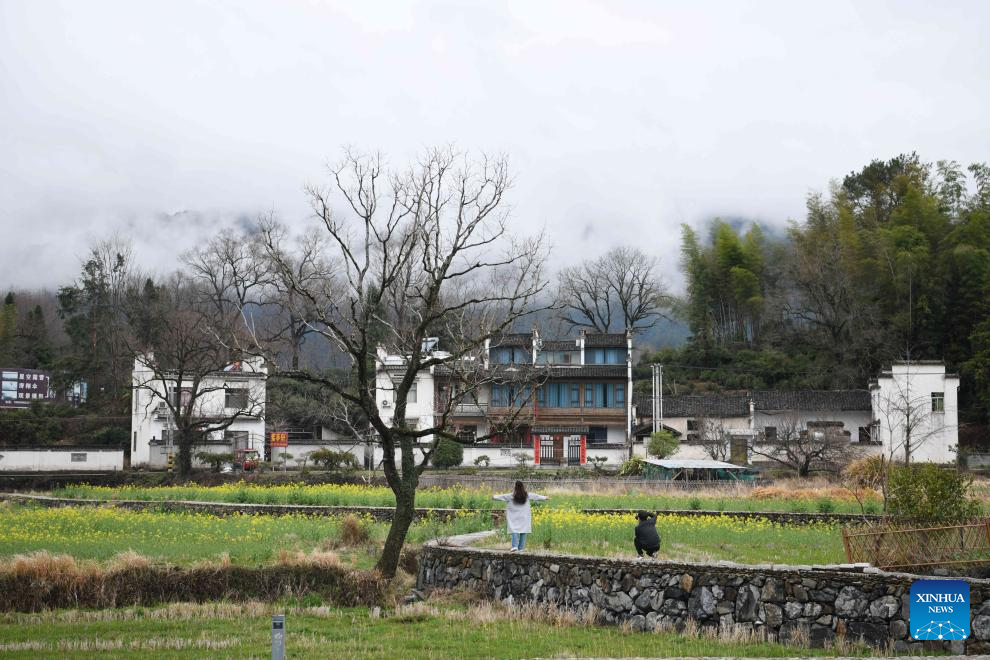 A tourist poses for a photo at Tachuan Village, Hongcun Township of Yixian County in Huangshan City, east China's Anhui Province, March 13, 2025. (Xinhua/Zhou Mu)
