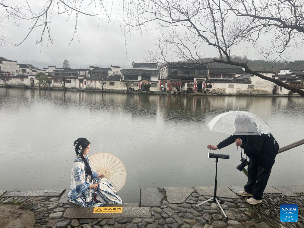 Tourists enjoy themselves at Hongcun Village, Hongcun Township of Yixian County, Huangshan City, east China's Anhui Province, March 14, 2025. (Xinhua/Zhou Mu)