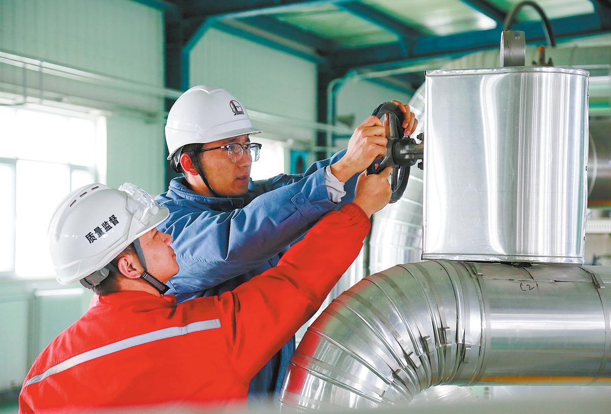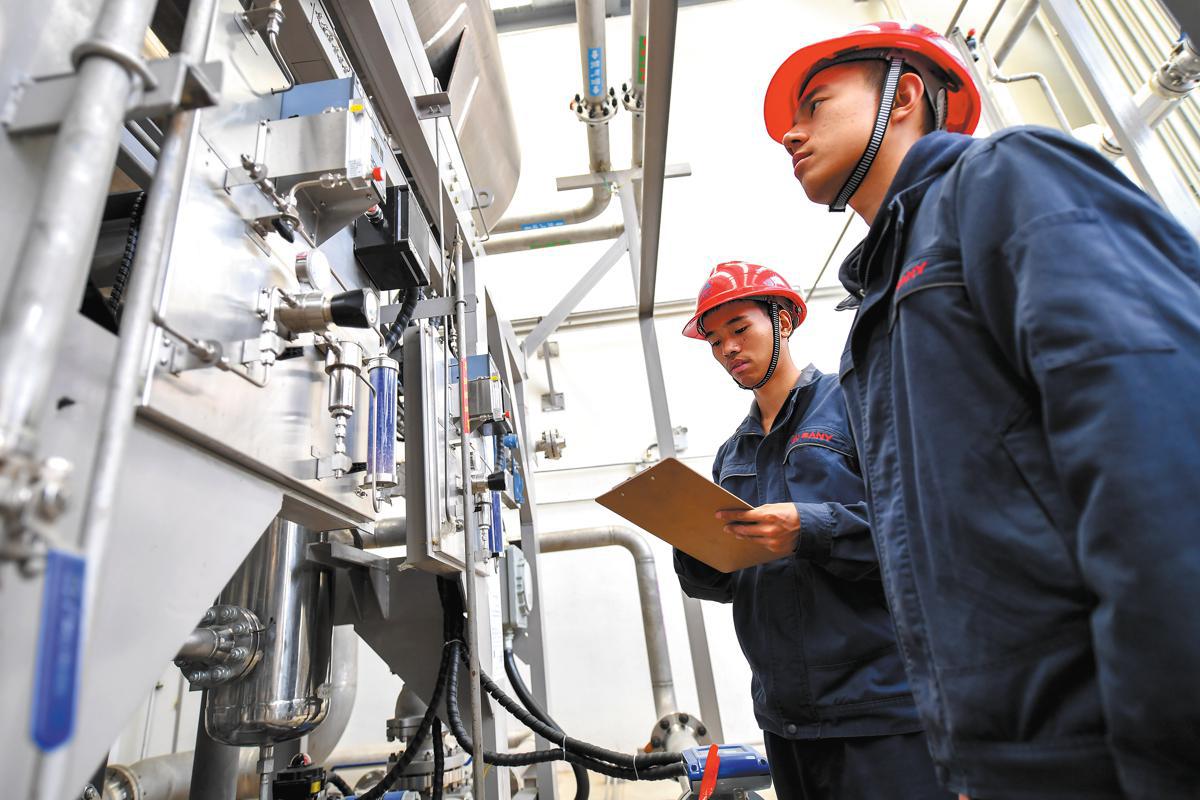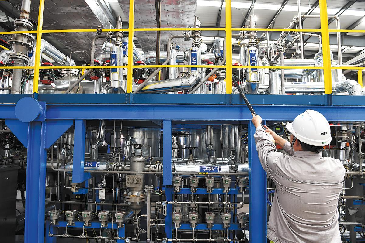 Workers inspect equipment at a station that produces hydrogen and charges hydrogen-powered vehicles in Changsha, Hunan province, in March last year. The station is able to serve more than 100 vehicles a day with clean, green energy. (Chen Zeguo/Xinhua)