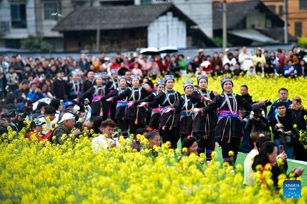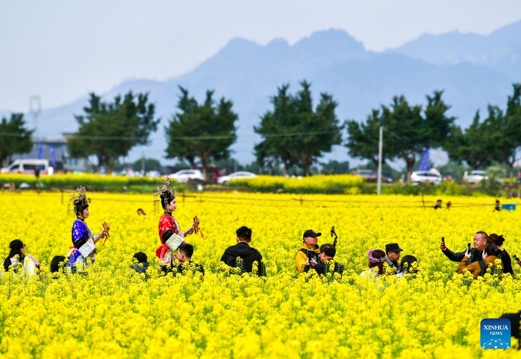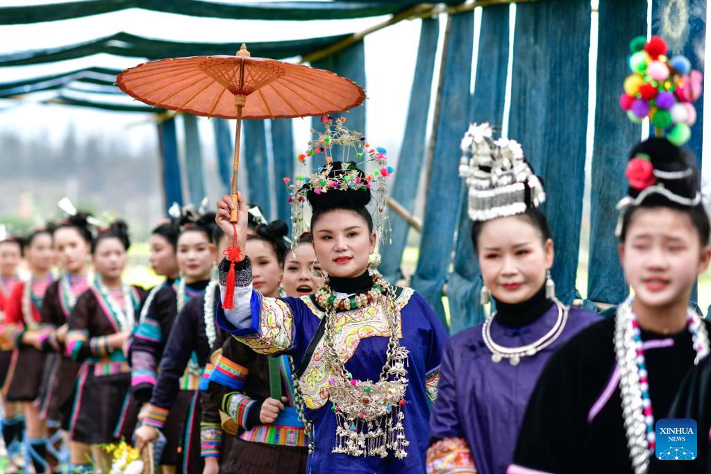 Villagers in ethnic costumes take part in a rural fashion show in Rongjiang County, southwest China's Guizhou Province, March 16, 2025.