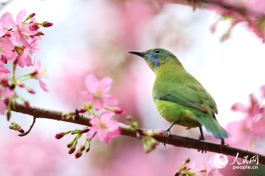 A green bird perches gracefully among the blossoms in a cherry tree in Xiamen, southeast China's Fujian Province. The bright green feathers of the bird contrast beautifully with the pink cherry blossoms. (People's Daily Online/Chen Bo)