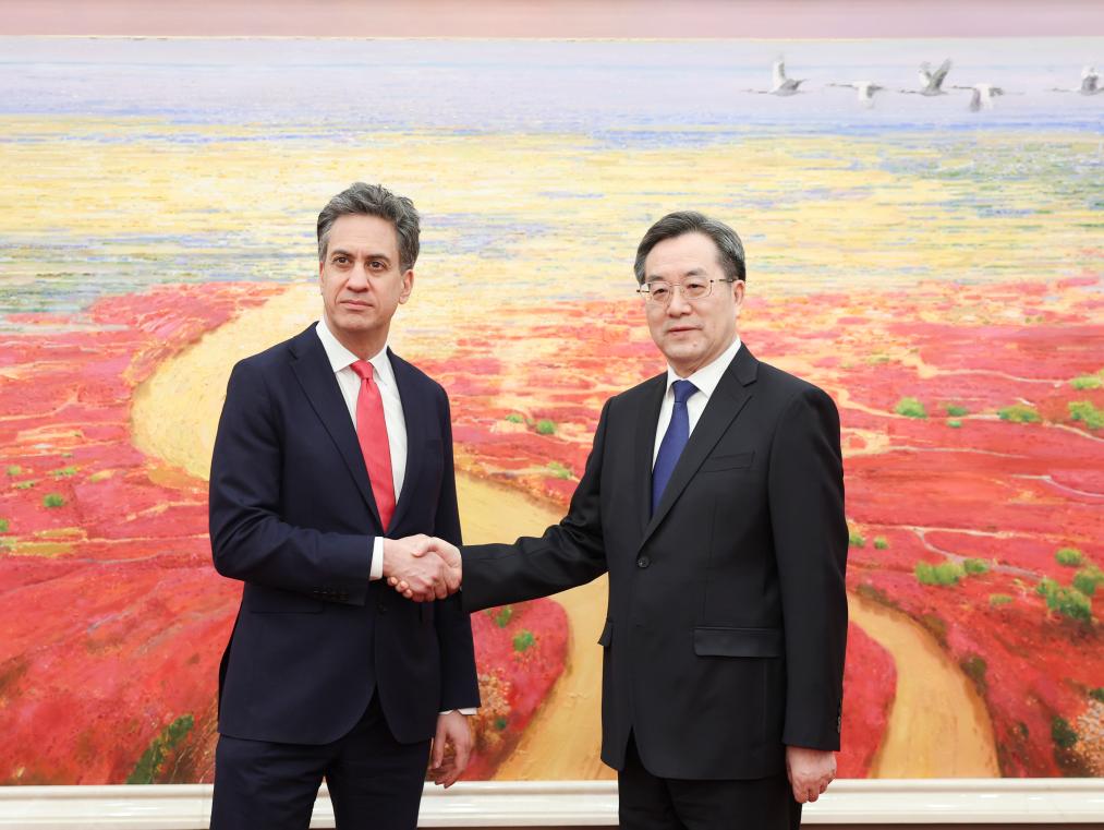BEIJING, March 17 (Xinhua) -- Chinese Vice Premier Ding Xuexiang met with Ed Miliband, UK Secretary of State for Energy Security and Net Zero, in Beijing on Monday. The two sides agreed to enhance cooperation in jointly addressing climate change.