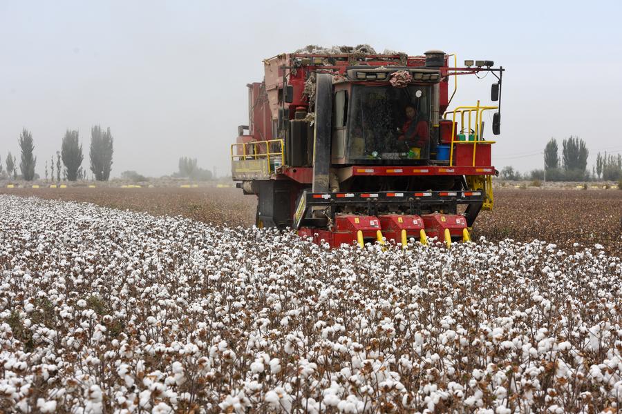 A cotton harvester is at work in Shawan City, northwest China's Xinjiang Uygur Autonomous Region, Oct. 8, 2024. (Photo by Guan Bing/Xinhua)