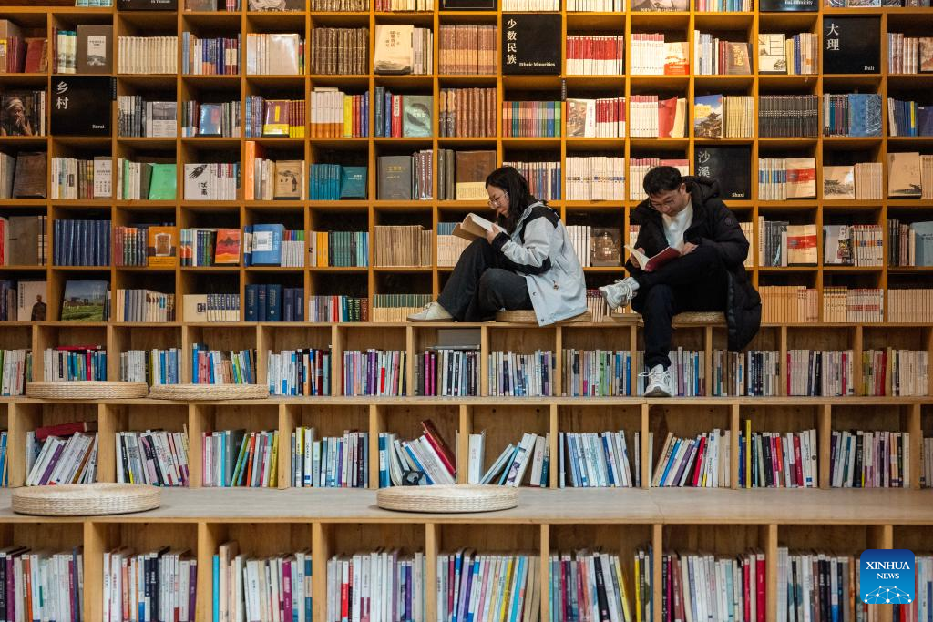 Tourists read books at a bookshop in Shaxi Town, Jianchuan County, southwest China's Yunnan Province, March 17, 2025. Shaxi, a remote township in Jianchuan County, was once an important trading hub for tea, herbs, silk and salt on the ancient Tea Horse Road, a trade route dating back to the Tang Dynasty (618-907).