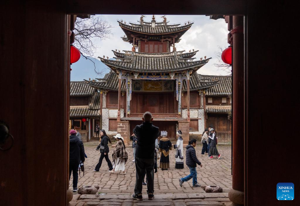 Tourists visit an ancient stage in Shaxi Town, Jianchuan County, southwest China's Yunnan Province, March 17, 2025. Shaxi, a remote township in Jianchuan County, was once an important trading hub for tea, herbs, silk and salt on the ancient Tea Horse Road, a trade route dating back to the Tang Dynasty (618-907).