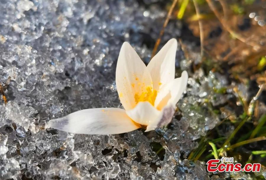 Wild lilies, also known as the top ice flowers, the first flower of spring in Xinjiang bloom on a meadow at an altitude of 1,200 meters to 3,000 meters, in the Ili Kazak Autonomous Prefecture, northwest China's Xinjiang Uygur Autonomous Region. (China News Service/Gong Xinyu)