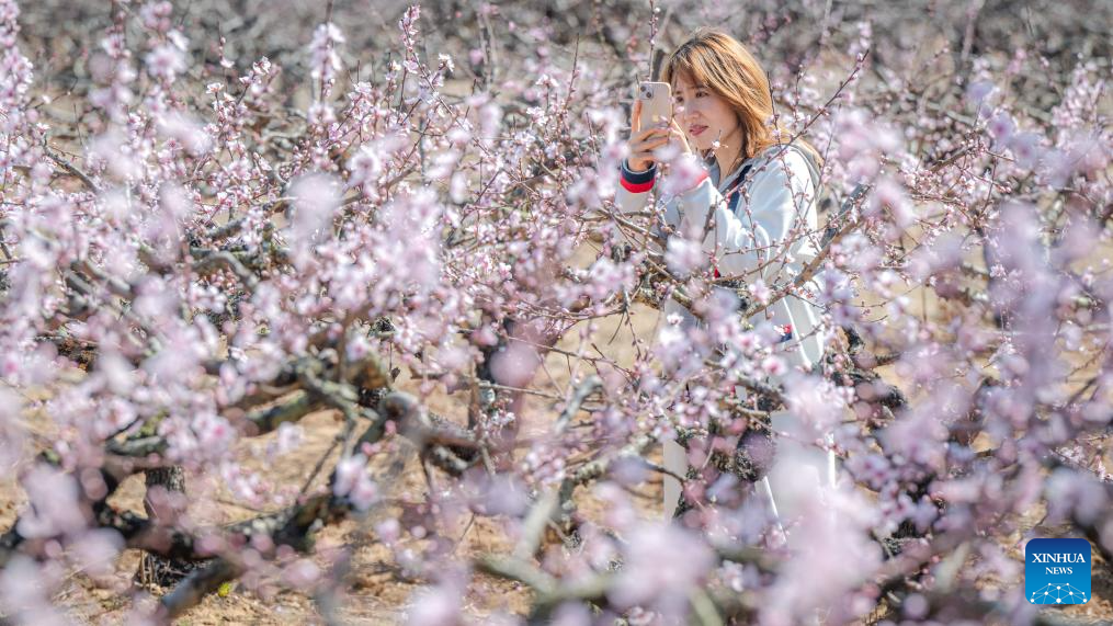 A tourist takes selfies with blossoms at a park in Xiaogan City, central China's Hubei Province, March 18, 2025. (Xinhua/Xiao Yijiu)