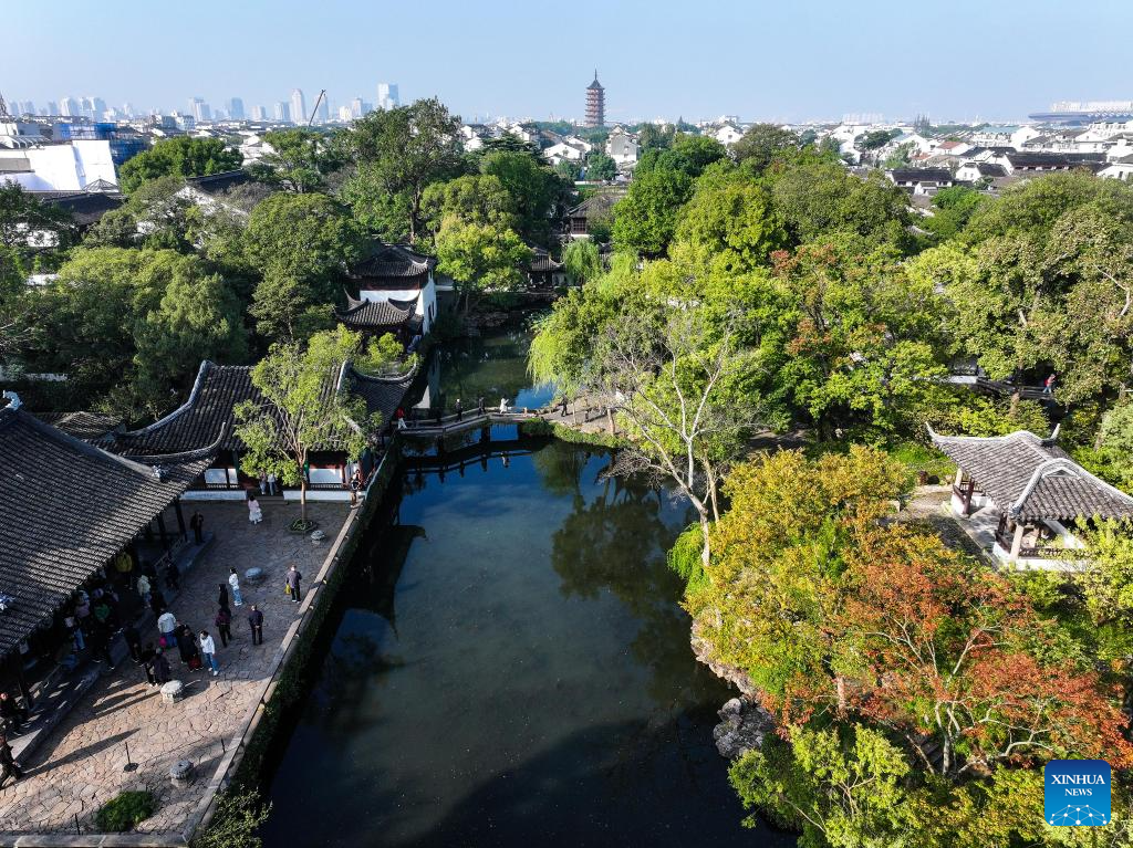 An aerial drone photo shows the scenery of the Huqiu scenic area in Suzhou, east China's Jiangsu Province, Oct. 23, 2024.
