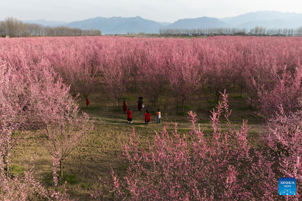 An aerial drone photo taken on March 18, 2025 shows tourists enjoying blooming plum flowers at a plantation in Huyi District of Xi'an, northwest China's Shaanxi Province. (Xinhua/Shao Rui)