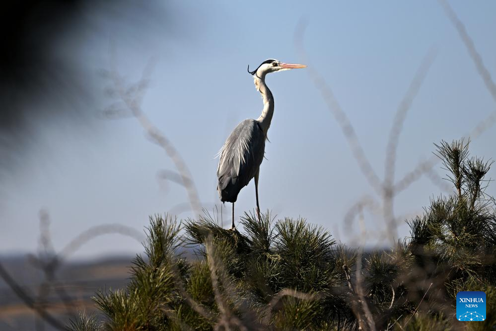 A heron perches on a tree in Jicui Town of Fangshan County, Lyuliang City, north China's Shanxi Province, March 19, 2025. A number of herons migrate to the town to build nests and breed in the spring, generating a unique ecological landscape. (Xinhua/Zhan Yan)