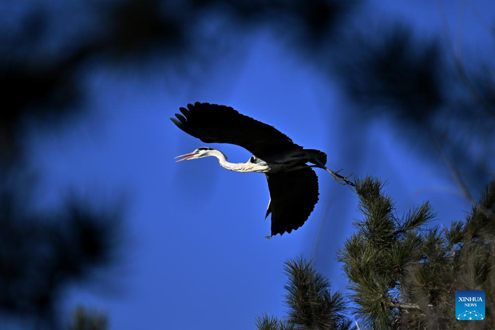 A heron flies in the sky in Jicui Town of Fangshan County, Lyuliang City, north China's Shanxi Province, March 19, 2025. A number of herons migrate to the town to build nests and breed in the spring, generating a unique ecological landscape. (Xinhua/Zhan Yan)