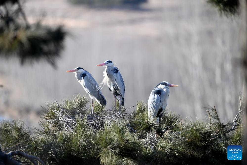 Herons perch on a tree in Jicui Town of Fangshan County, Lyuliang City, north China's Shanxi Province, March 19, 2025. A number of herons migrate to the town to build nests and breed in the spring, generating a unique ecological landscape. (Photo by Liu Liangliang/Xinhua)