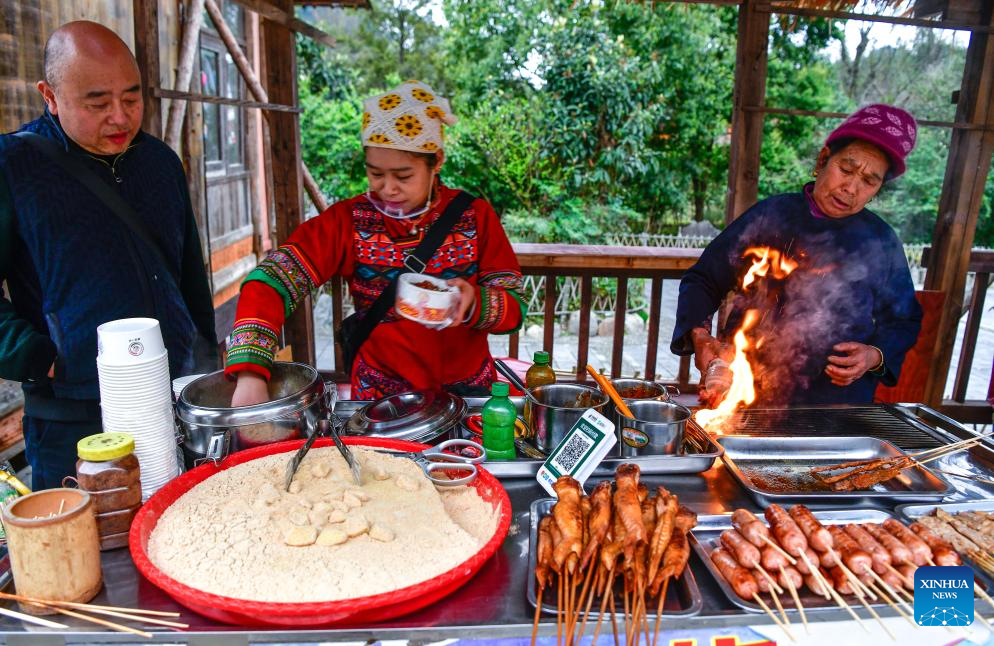 Villagers make sticky rice and grilled pork for tourists at the Zhaoxing Dong Village in Liping County of Qiandongnan Miao and Dong Autonomous Prefecture, southwest China's Guizhou Province, March 17, 2025. Located in Liping County of Qiandongnan Miao and Dong Autonomous Prefecture, Zhaoxing Dong Village is home to over a thousand households of the Dong ethnic group. The traditional architectural style and rich cultural heritage of the Dong ethnic group are well-preserved.