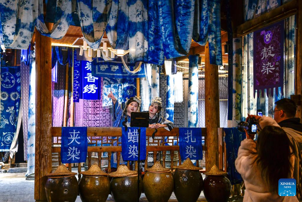 A villager dries traditional Dong cloth at the Zhaoxing Dong Village in Liping County of Qiandongnan Miao and Dong Autonomous Prefecture, southwest China's Guizhou Province, March 18, 2025. Located in Liping County of Qiandongnan Miao and Dong Autonomous Prefecture, Zhaoxing Dong Village is home to over a thousand households of the Dong ethnic group. The traditional architectural style and rich cultural heritage of the Dong ethnic group are well-preserved.