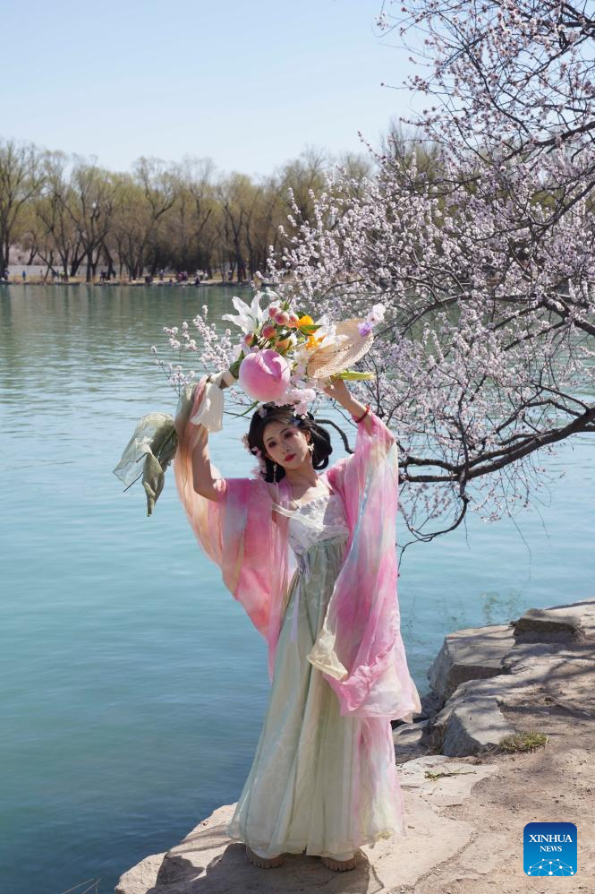 A tourist poses for photos with peach blossoms at the Summer Palace in Beijing, capital of China, March 19, 2025. (Xinhua/Yin Dongxun)