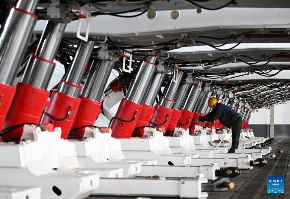 A staff member works at the final assembly workshop for hydraulic supports at Linzhou Heavy Machinery Group Co., Ltd. in the Hongqi Canal Economic and Technological Development Zone of Linzhou City, central China's Henan Province, March 19, 2025. (Xinhua/Li Jianan)
