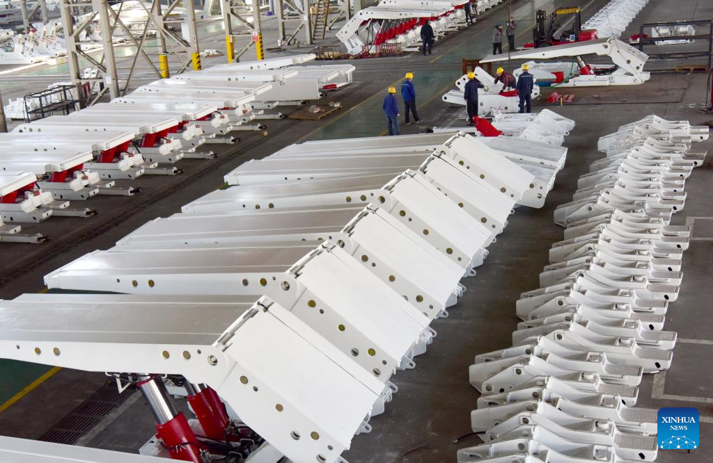 Workers conducts lifting operations at the final assembly workshop for hydraulic supports at Linzhou Heavy Machinery Group Co., Ltd. in the Hongqi Canal Economic and Technological Development Zone of Linzhou City, central China's Henan Province, March 19, 2025. (Xinhua/Zhu Xiang)